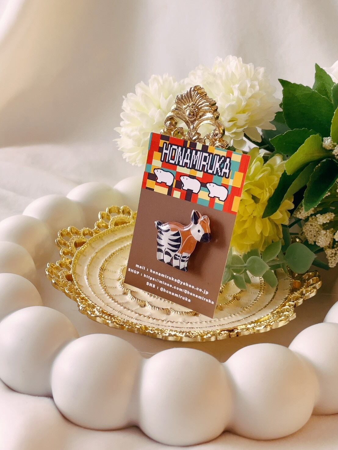 ・おすすめポイント…シマシマの足がオシャレなオカピのデザイン✿個性派だけどやさしく寄り添う癒しのピンバッチです!
