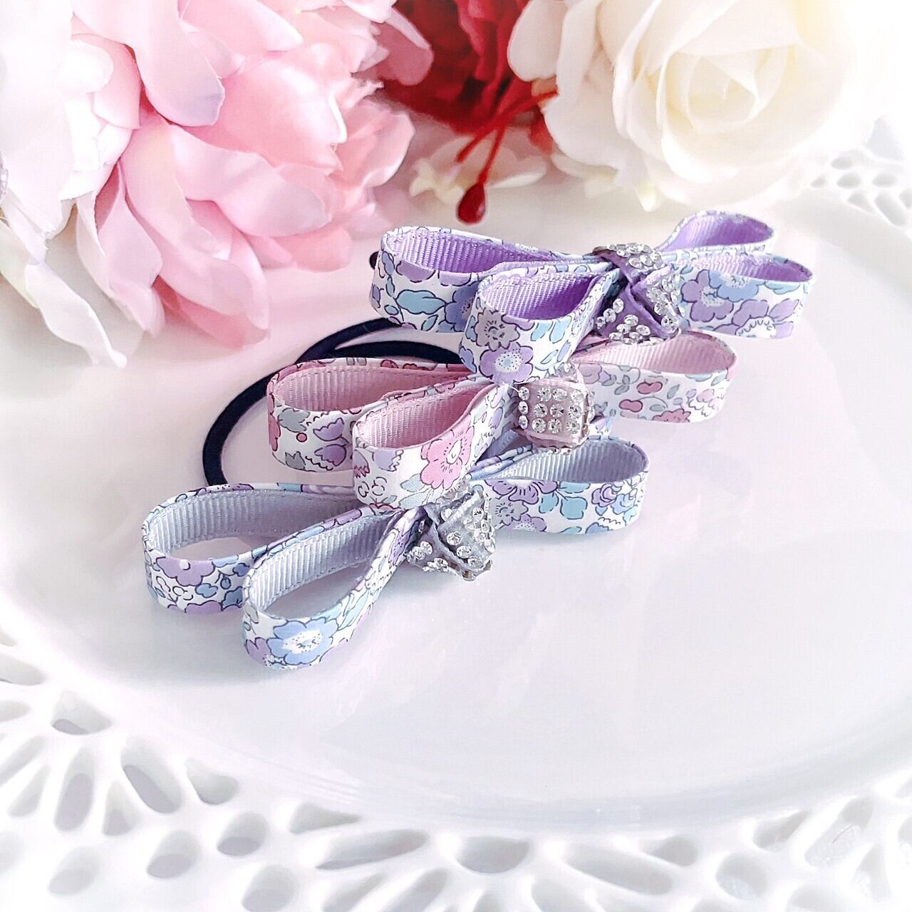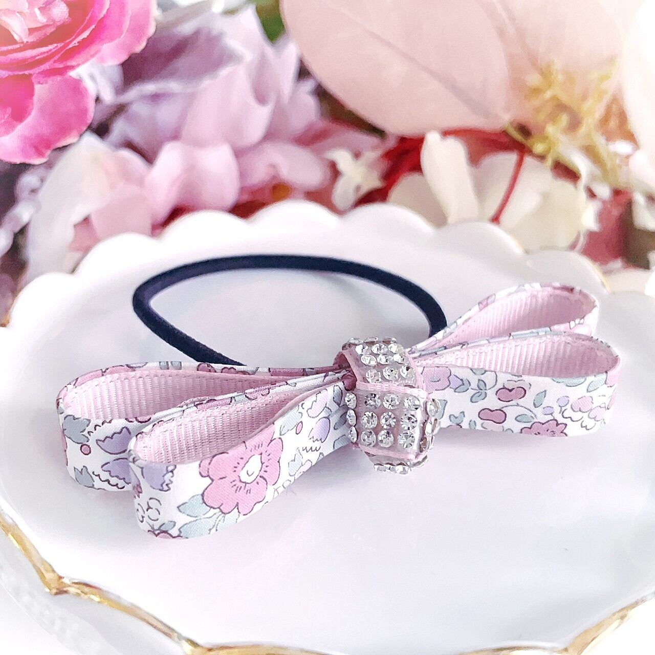 ・リバティ「ベッツィアン」を使用した細身のおリボンをクリスタルでおめかし。