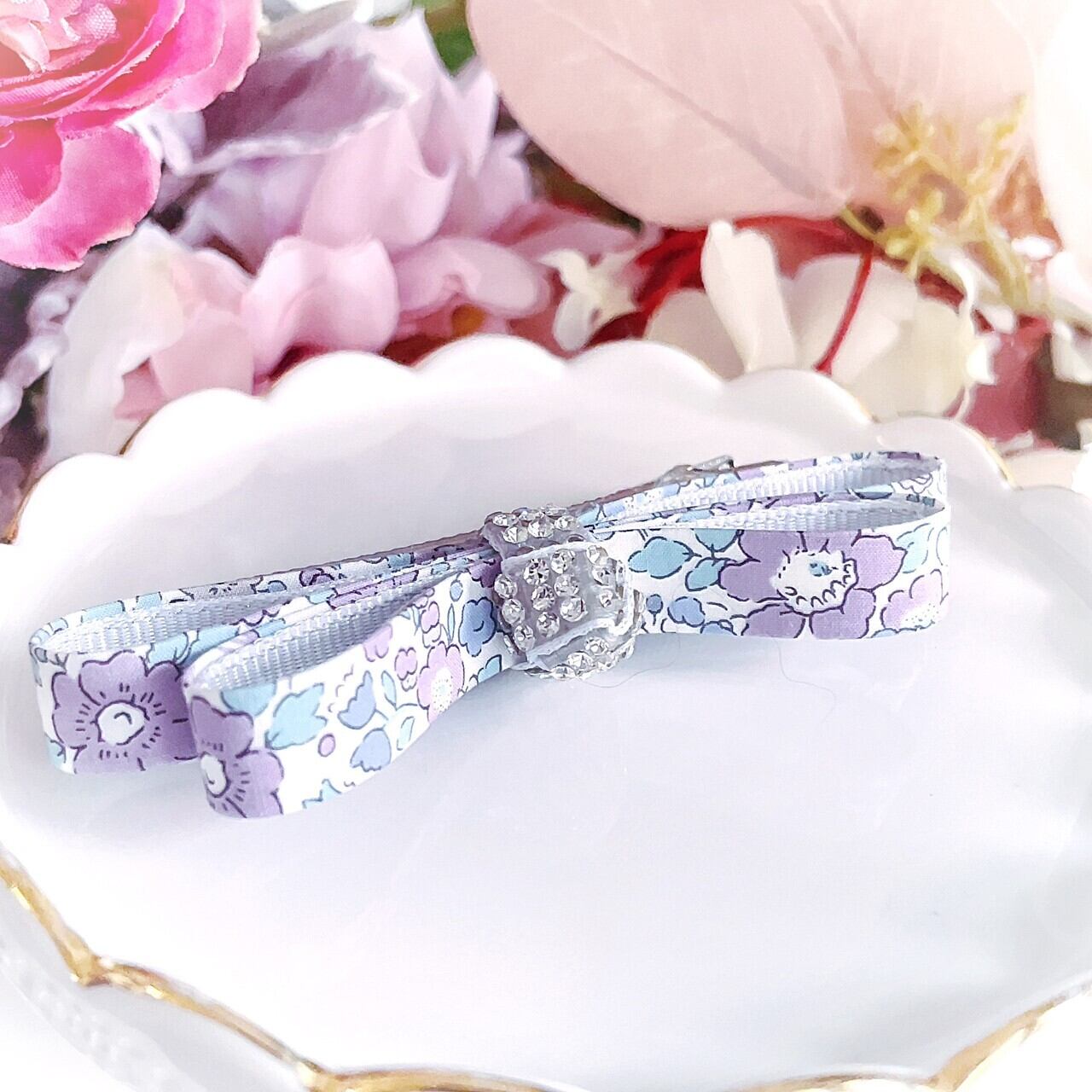 リバティ「ベッツィアン」を使用した細身のおリボンをクリスタルでおめかし。