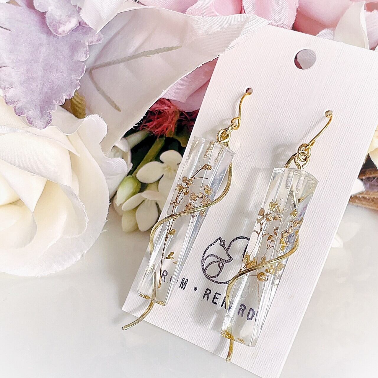 鉱石の様な形のモチーフの中にゴールドのドライフラワーと、ゴールドの粒が入ったピアスです。