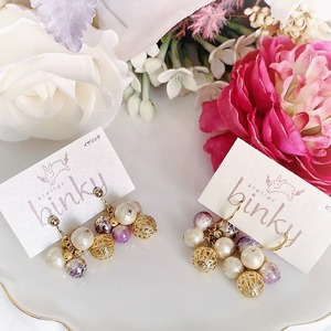唐草ビーズや透かし玉、コットンパールをたっぷり使った、耳元を華やかに彩るピアス。
