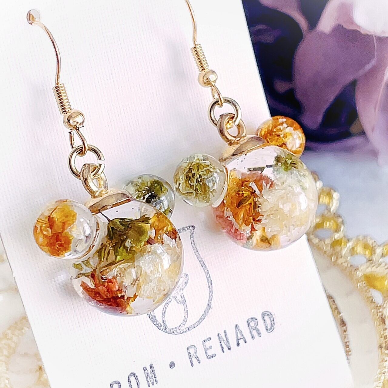 色とりどりのドライフラワーが入ったくまのピアスです。温かみのあるカラーのくまが耳元てまゆらゆらと揺れます。
